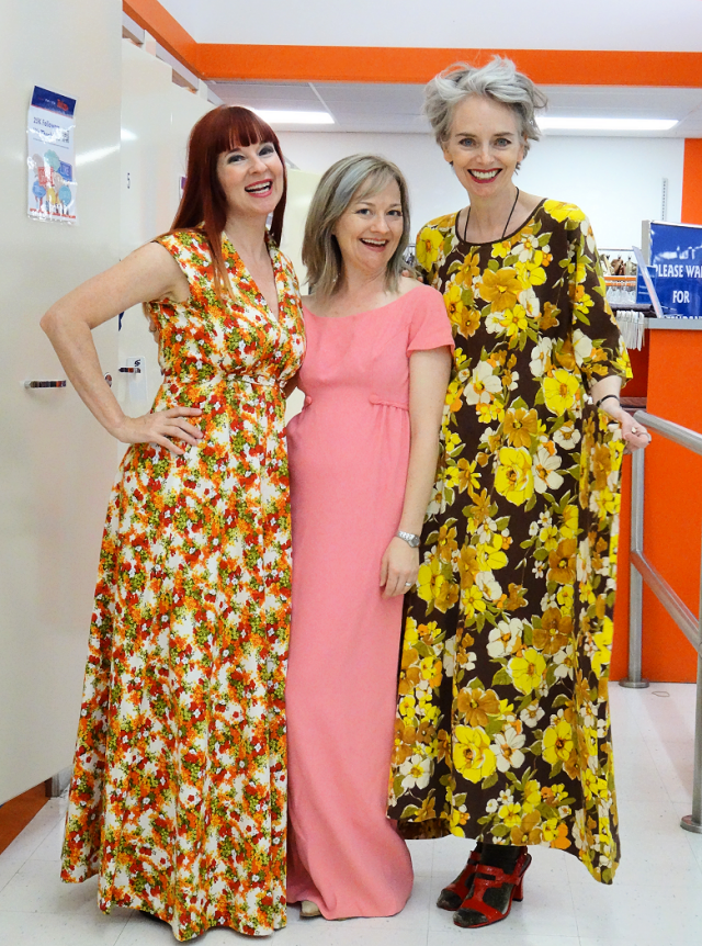 Faster than a woman swiping the last chocolate croissant, more powerful than matte lipstick, able to leap scummy puddles in a single bound in skyhigh platforms. Look! Up ahead (photo below) - It's a mutant orange! It's a giant cheese! No, it's Melanie!Below is my latest superpower dress, Le Traffic Cone (sister to my traffic cone coat), which I picked up during a blogger shopping spree at Talize Thrift in Delta, BC, with Suzanne (SuzanneCarillo.com), Sue (A Colourful Canvas), and Sherry (Petite Over 40), post on it here.